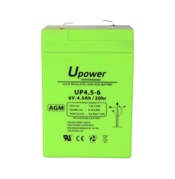 6,10 €Upower. Batteria ricaricabile. Tecnologia piombo-acido AGM. Voltaggio 6 V. Capacità 4.5 Ah. 106 x 70x x 47/ 810g. Per backup o uso diretto