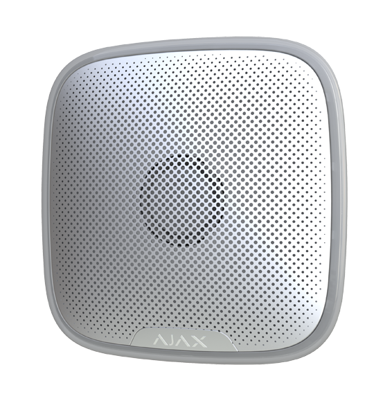 Sirena per esterni. Senza fili 868 MHz Jeweller. Certificato grado 2. Pressione sonora massima 113 dB. LED segnalazione. Alimentazione 12 VDC/ 4 pile CR123A 3.0 V. Colore bianco
