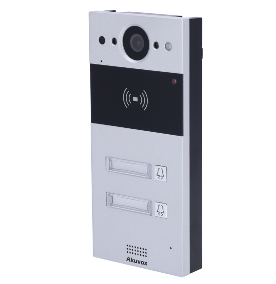 Videocitofono IP da superficie. Telecamera 2 Mp | Audio bidirezionale Crystal Clear. Apertura tramite scheda EM/MF e NFC | 2 relè. 2 appartamenti | PoE, SIP standard. Manutenzione Cloud. Connessione via Cloud | Uscita 12V