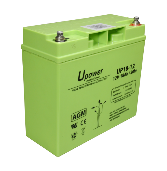 Upower. Batteria ricaricabile. Tecnologia piombo-acido AGM. Voltaggio 12 V. Capacità 18.0 Ah. 167.5 x 181.5x x 77/ 5700g. Per backup o uso diretto