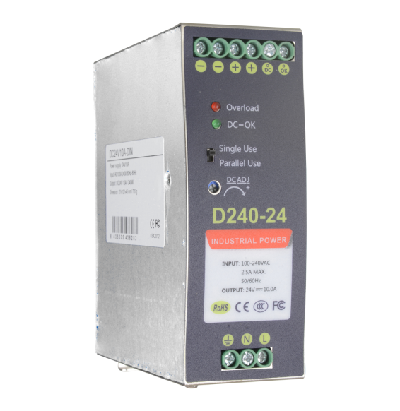 Alimentatore a commutazione. uscita DC 24 V 10 A / 240 W. 2 uscite. Voltaggio in entrata 90 V ~ 264 V. 100 (P) x 94 (I) x 40 (H) mm. Montaggio su guida DIN