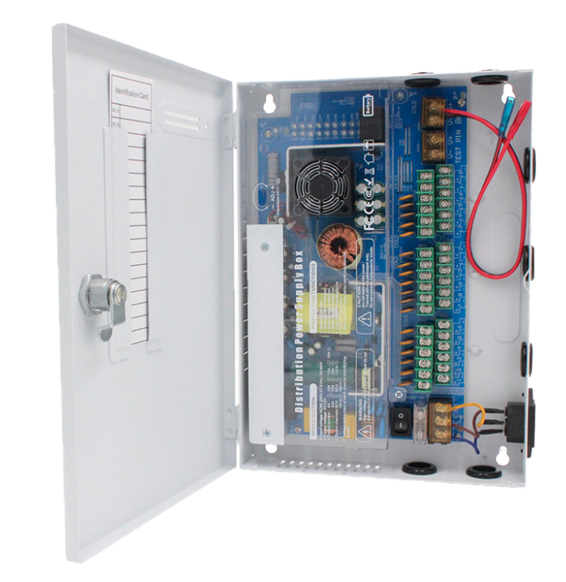 Scatola di distribuzione di alimentazione. Ingresso AC 180 V~246 V. 18 uscite Fuse. Fusibile di protezione ripristinabile. Voltaggio d'uscita 12 V / 250 W. Corpo metallico