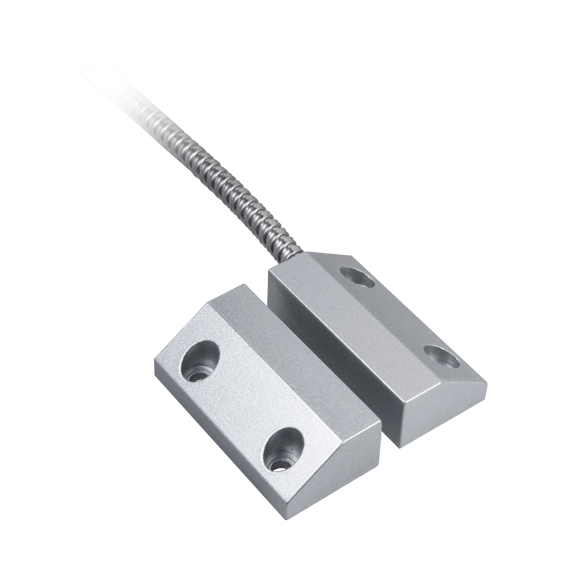 Contatto magnetico. Adatto per l'installazione in metallo. Tecnologia Reed ad Alta potenza. Sistema di connessione 2 fili protetti da rete metallica. Resistenza agli urti meccanici ed elettrici