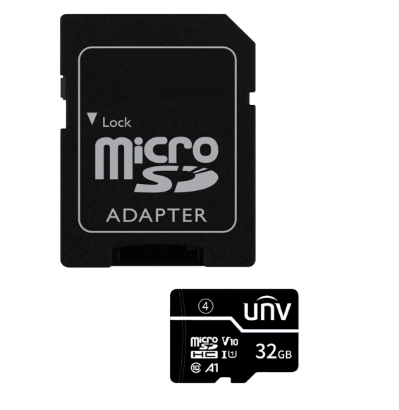 Scheda microSD con adattatore Uniview. Capacità 32 GB. Classe 10 | Velocità R/W: 70/30 MB/s. Cicli E/P: fino a 300. Telecamere Home, Smartphone, Tablet