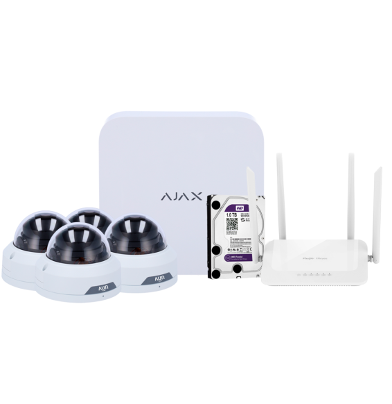 Kit di videosorveglianza Ajax. Videoregistratore Ajax da 8 canali. 4 telecamere turret WiFi da 2 Mpx Uniview. Router WiFi da 4 porte. Hard disk da 1 TB. Integrazione tramite ONVIF