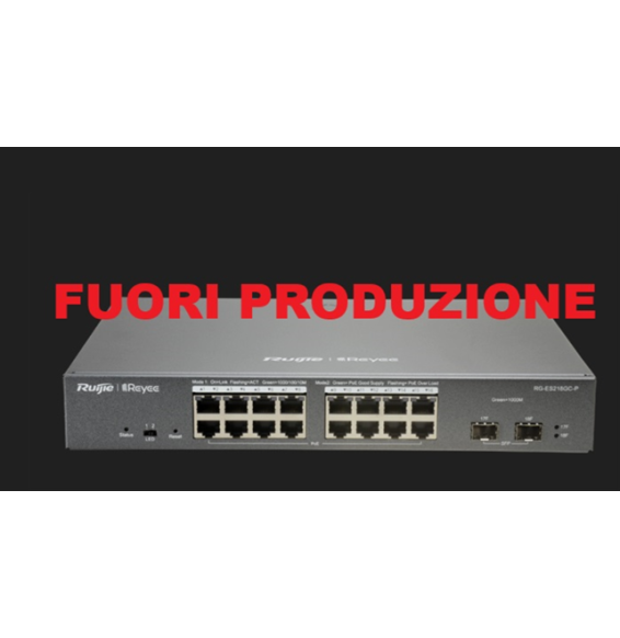 Reyee Switch PoE Cloud Managed. 16 porte PoE 802.3af/at + 2 SFP. 16 RJ45 10/100/1000Mbps + 2 SFP 10/100/1000Mbps. 30W per porta 802.3af/at / Massimo 240W. VLAN/Port Isolation/Loop Detection. Limite di Velocità della Porta