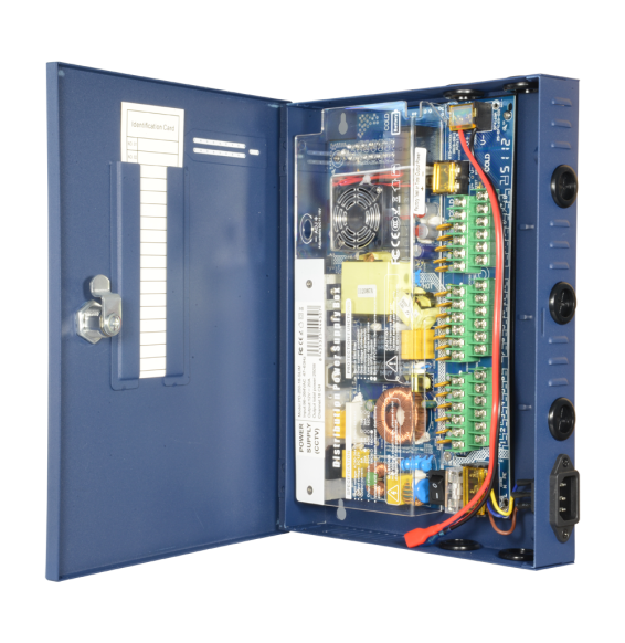 Scatola di distribuzione di potenza slim. 1 ingresso AC 220 V 5OHz. 18 uscite con doppino rame. Fusibile di protezione ripristinabile. Voltaggio d'uscita 12 V / 250 W. Corpo metallico