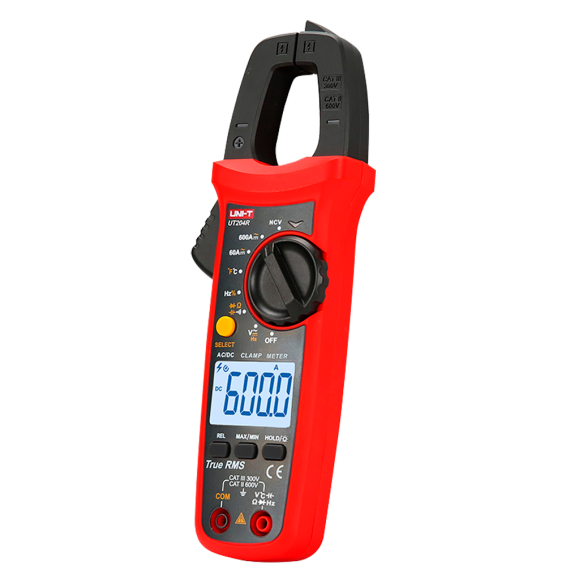 Pinza amperometrica. Misura in DC fino a 600V e 600A. Misura CA fino a 600V e 600A. Resistenza/capacitanza/frequenza/temperatura. Intervallo automatico | Test di diodi | True RMS. Apertura pinza di 28mm