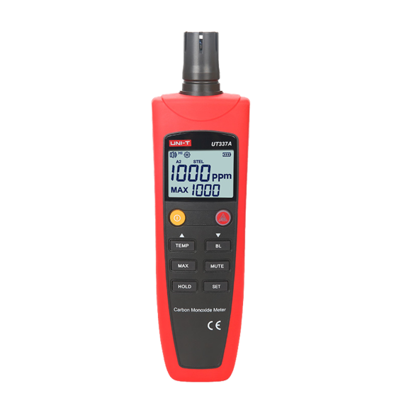 Misuratore di monossido di carbonio (CO). Incorpora un sensore elettrochimico di gas. Allarme configurabile con segnale acustico. Visualizzazione del valore massimo registrato. Autotest del sensore.
