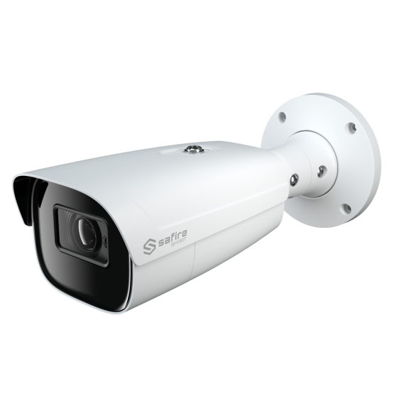 Safire Smart. Telecamera Bullet IP gamma I1 IA Avanzata. Risoluzione 6 Megapixel (3296×856 ). Ottica motorizzata 2.8-12 mm | Audio | IR 70m. IA Avanzata:Perimetro, Volto, Conteggio, Metadati. Waterproof IP67 | PoE (IEEE802.3af) |Allarme