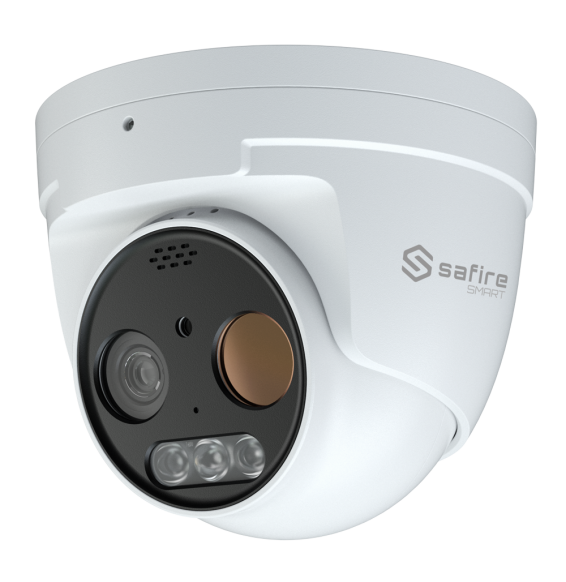 Telecamera termica a doppia ottica IP Turret Safire Smart. Sensore termico 256x192 VOx | Ottica 7 mm. Sensore ottico1/2.7” 5 Mpx | Lente 8 mm. Sensibilità termica ≤ 50mK. IA basata sulla classificazione di persone e veicoli. Intervallo di misurazione della temperatura -20~150ºC / ± 8ºC